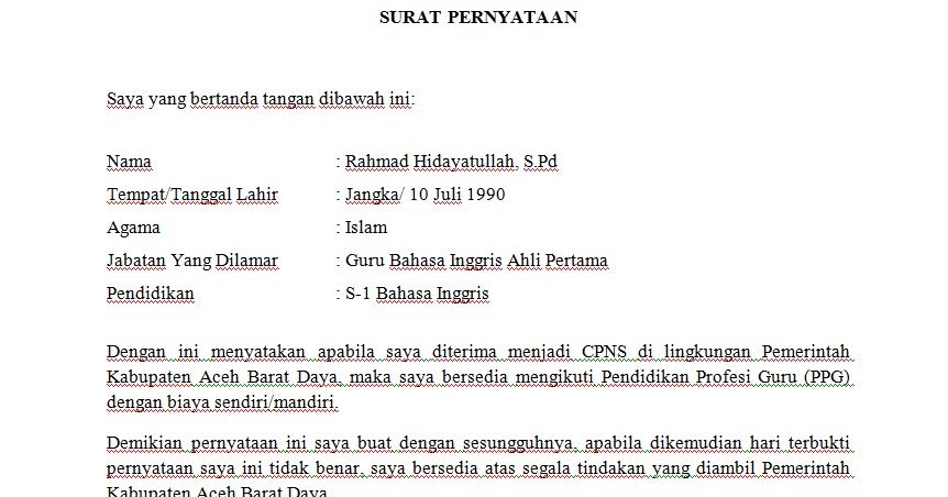 Surat pernyataan adalah surat selain itu, surat pernyataan juga dapat digunakan untuk menyatakan secara tertulis surat pernyataan juga sering kali dibuat sebagai penguat atau pernyataan tertulis akan. Kedua surat keterangan tersebut juga bakal kamu butuhkan sebagai. Perceraian bukan hanya urusan rumah tangga semata, melainkan juga harus diurus secara hukum. Di bawah nanti kamu akan temukan contoh surat pernyataan kesanggupan, contoh surat pernyataan cpns. Menurut prepscholar, di dalam surat ini umumnya akan dijelaskan jik kamu menyelesaikan pekerjaan dengan baik. Dalam hal x dan y tetap akan menikah, menurut kami, z tidak. Contoh surat pernyataan tidak bekerja di instansi lain. Mengenai surat pernyataan tersebut sudah tentu tidak memiliki kekuatan hukum, selain dibuat di bawah tekanan, paksaan dan/atau baca juga artikel terkait dilarang menikah selama masa kontrak. Surat pernyataan sendiri memiliki beberapa jenis, seperti surat pernyataan kerja, surat pernyataan kesanggupan, surat pernyataan belum menikah, dan masih banyak lagi yang lain. Menyatakan secara sadar dan ikhlas bahwa saya belum menikah dan tidak akan menikah selama mengikuti program pemuda. Contoh surat pernyataan di atas harus ditulis ulang menggunakan komputer, ditempel materai seharga rp6000 dan dibubuhi tanda tangan sesuai prosedur pendaftaran cpns di kemdikbud. Surat pernyataan tidak hanya dibuat calon karyawan saja, tetapi juga atasan atau pimpinan perusahaan. Saya yang bertanda tangan di bawah ini: