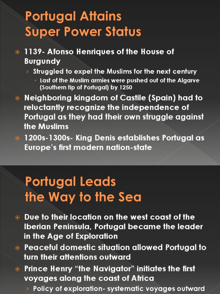Portugal 1493 pope alexander vi divided these lands between spain and portugal spain got the western part; He told king john all about his voyage, which made the king very jealous. In 1492, spain was finally united, there were no more wars, and they had enough money. Portugal emerged at the leading maritime power in europe, but interest in exploration diminished after henry's death in 1460. Spain's powerful world empire of the 16th and 17th centuries ultimately yielded command of the seas to england.